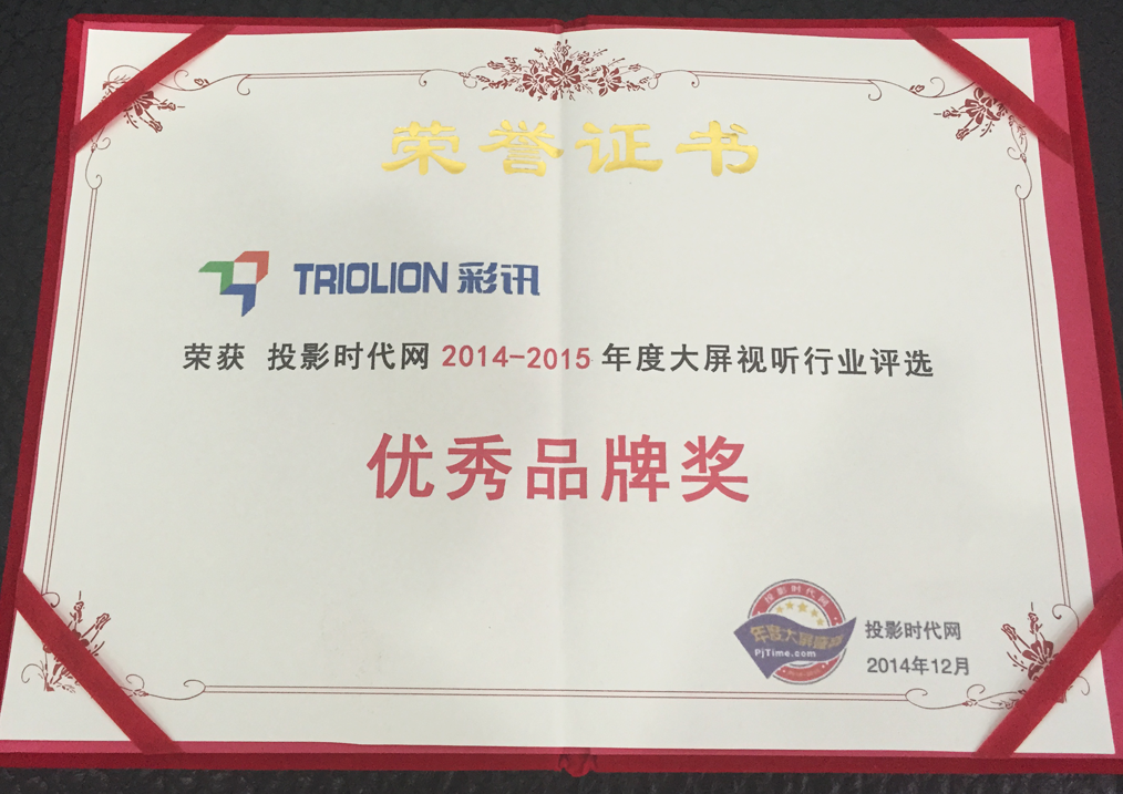 投影時代網年度優秀品牌獎證書